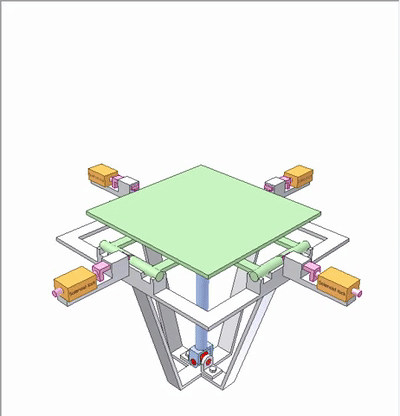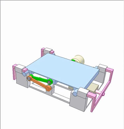 2、这时黄色电机带动橙色拉杆顺时针旋转,橙色拉杆又带动绿色拉杆运动,从而推动浅蓝色板绕着左侧轴逆时针旋转;而当黄色电机带动橙色拉杆逆时针旋转时,浅蓝色板就会绕着左侧轴顺时针旋转,直到恢复水平位置;