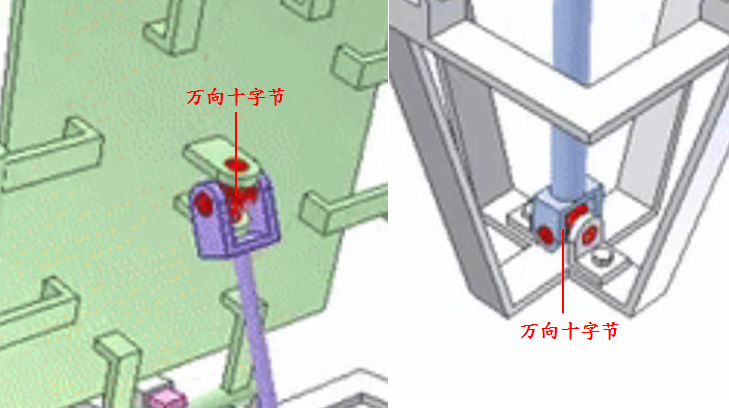 蓝色的推杆和紫色的活塞升起平板进行翻转,可以看到推杆的底部和顶部都是万向十字节(见下图),这是因为推杆在推动绿色板升起时,会发生各个方向的位移。(大家可以借鉴一下这个机构,很多时候都会用到)