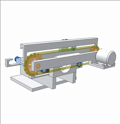 1、白色的电机带动链轮旋转,链轮又通过链条带着上面的绿色滑块在白色滑槽内左右滑动;