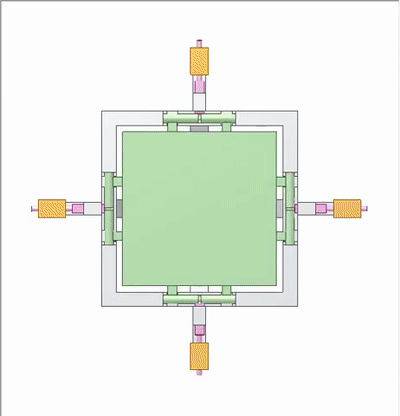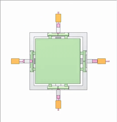 在实际应用时,大家只需要通过程序控制相应的橙色气缸伸出(当然要保证其他橙色气缸是缩回的状态),就可以做到绿色板向对应的方向翻转。