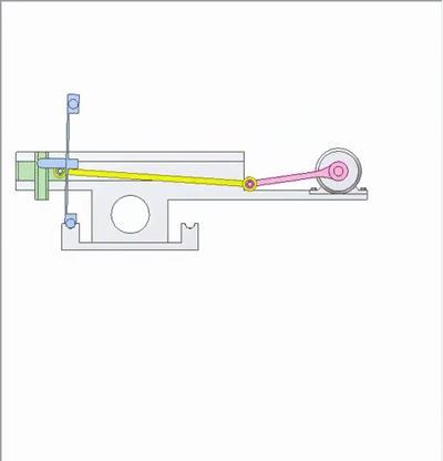 1、白色电机带动粉色连杆逆时针旋转,然后通过黄色连杆推动绿色滑块在白色固定座滑槽内左右滑动(怎么有点像顺口溜...);