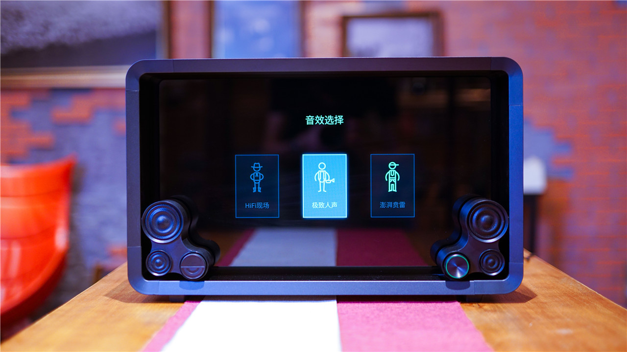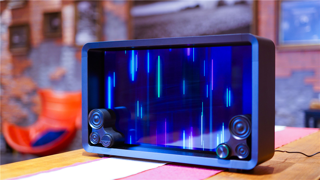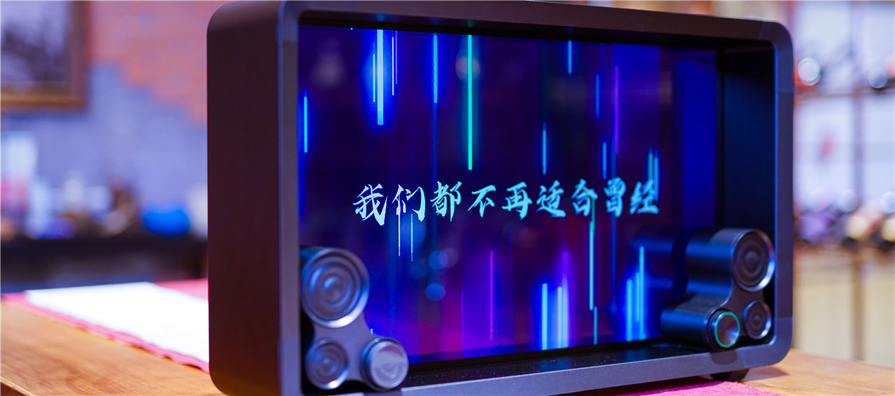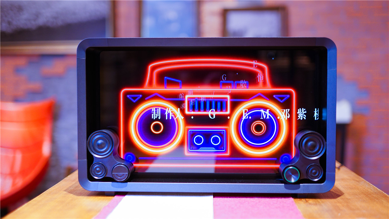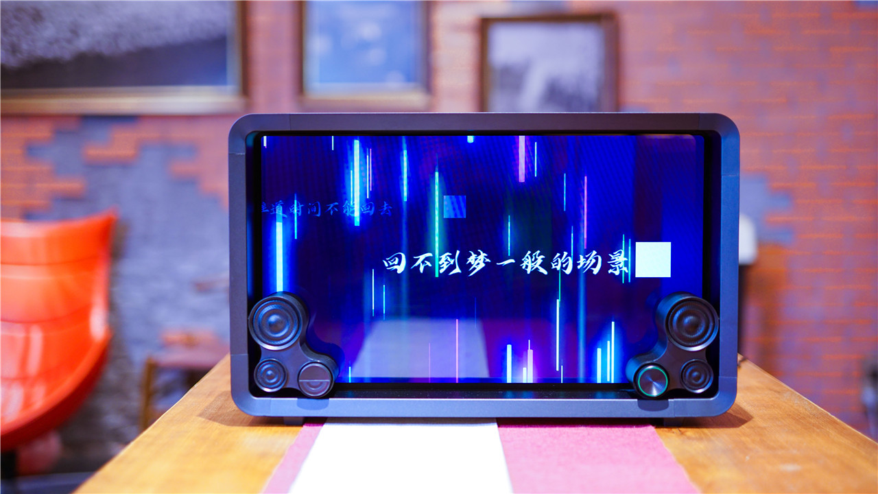Lyiew 悬浮歌词蓝牙音箱开机之后,前面板的整体视觉效果都达到了高度,炫彩的动态画面以及凸显的文字给人一种如梦如幻的感觉,暮光显示悬浮歌词的效果让超黑场显示技术得到了展现的舞台。
