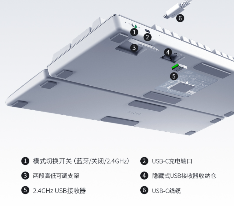 雷蛇 Pro Type Ultra 为一把三模键盘,支持 USB-C 有线连接、蓝牙 5.0 连接以及 2.4GHz 无线连接。在电池续航方面雷蛇表示可在蓝牙 5.0 模式下最多使用 214 小时,在 2.4GHz 模式下最多使用 207 小时(两者测试数据均为未开启键盘背光情况)。键盘底部为常规两段式脚撑,并设置了收纳位用于收纳 2.4GHz 接收器,且该接收器可以与雷蛇 Pro Click Mini 无线鼠标共用,只需使用一个接收器让用户告别使用多个 USB 接收器的连接烦恼。