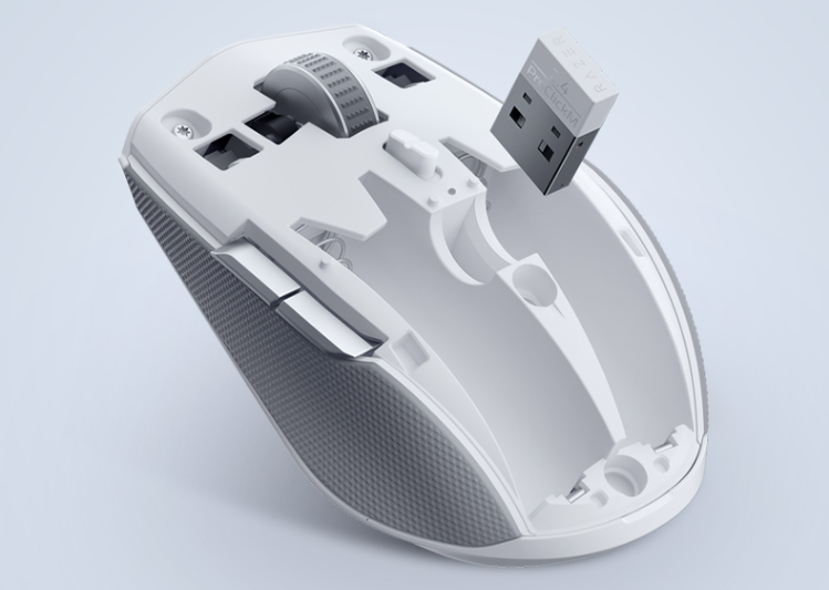 鼠标配有两节 5 号电池仓,且只需一节电池就可为鼠标供给电量,用户也可以满配电池以获得更长的续航时间以及更稳定的鼠标重心。官方宣称在电池仓两节电池满配的情况下,蓝牙 5.0 模式可使用最长 725 小时,2.4GHz 模式可使用最长 465 小时。
