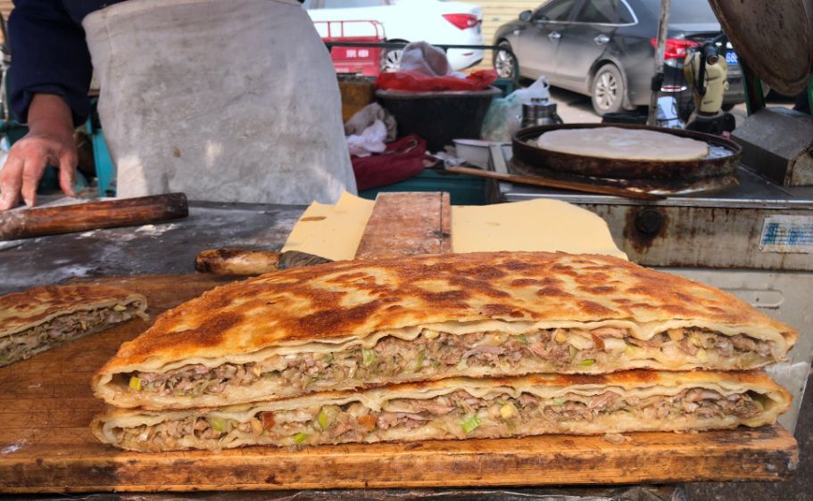 郓城壮馍,山东郓城著名的传统小吃,椭圆形,皮分4层,面皮肉馅、馅以鲜牛肉为主,也有素馅的,如鸡蛋、韭菜等,以葱、姜、菜蔬、香油等多种祖传佐料搅拌而成。皮为小麦精粉,经过面板面、馅包装成形后,放在特制工具平底煎盘(铁制)中进行油煎炸加工,火候和时间要恰到好处,经几次翻动即成。熟后的成品壮馍,色泽金黄,外焦内嫩,食之鲜而不膻,香而不腻。