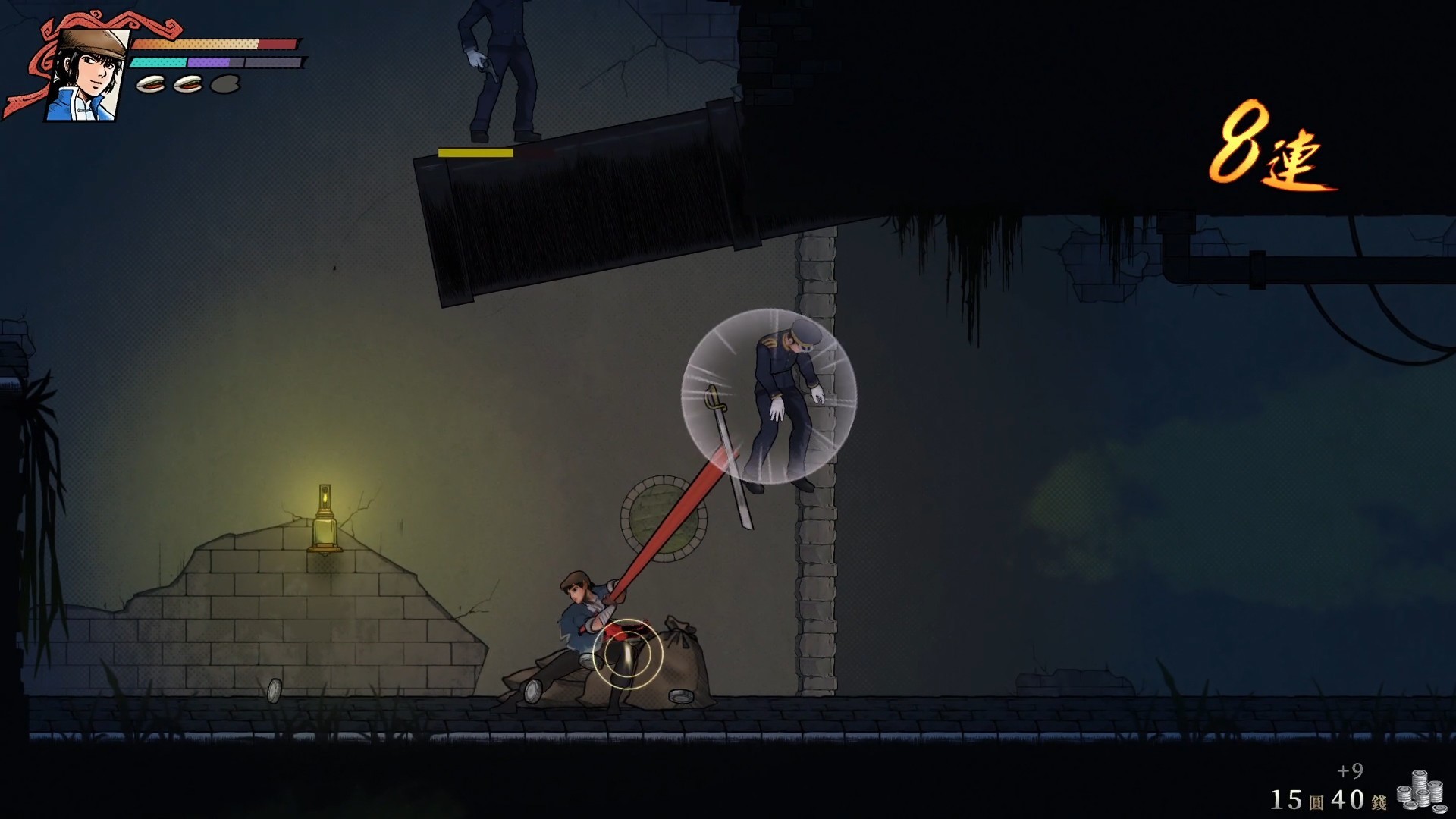 作为一款横板动作游戏,其战斗节奏还是非常快的,虽然主要只有普通攻击和武术攻击,配合上挑、坠地可以打出非常华丽的连招,再辅以夺取敌人兵器,极大地丰富了攻击手段,闪避以及在被攻击时的完美闪避触发影子效果,让整个战斗过程充满了变化,行云流水一套下来非常赏心悦目!