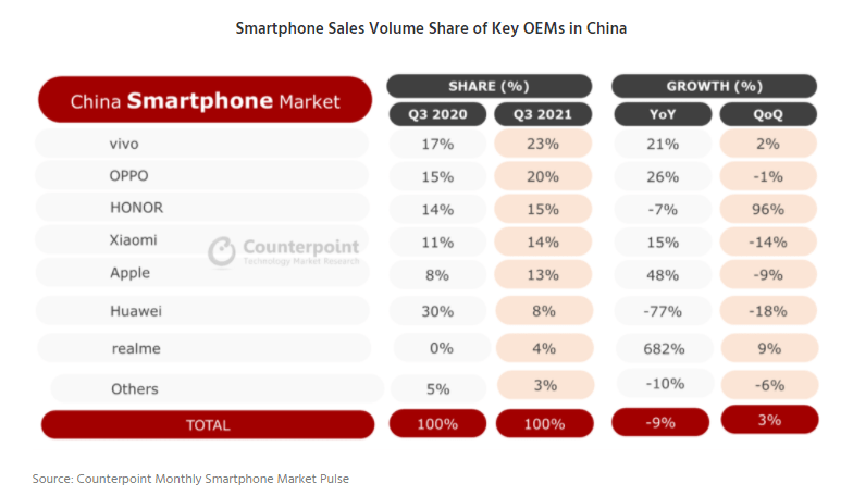 为什么荣耀会选择在这个时间点落子智能制造产业?首先,离不开它今年的市场表现。荣耀今年中国区市场份额从上半年最低谷时的3%到9月16.2%,经历深V反弹。根据第三方机构Counterpoint Research发布的数据显示:第三季度,荣耀以15%的季度市场份额重返前三,环比大涨96%,是2021年第3季度销量增长最快的一个品牌。