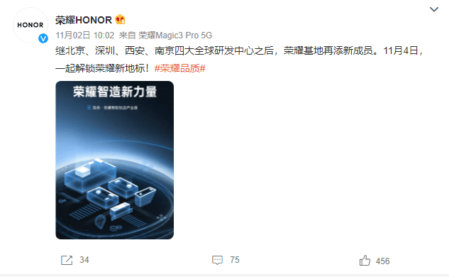 11月2日,荣耀官方微博发布了一张#解锁新地标#的海报,海报中充满了科技元素,并有“深圳·荣耀智慧制造产业园”的定位字样,并发文表示“继北京、深圳、西安、南京四大全球研发中心之后,荣耀基地再添新成员。11月4日,一起解锁荣耀新地标!”