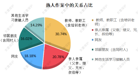 根据“女童保护”统计,2020年媒体公开报道的332起性侵儿童案例中,231起为熟人作案,其中, 教师、教职工(含培训老师)作案71起,占比30.74% 。