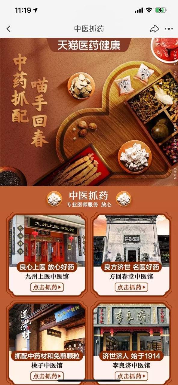 今年,方回春堂、固生堂、小鹿中医等14家知名中医药馆首次参加天猫双11,为消费者提供上千种中药饮片和上百张中医名方。消费者在手机淘宝搜索“抓药”,进入“中医抓药”官方入口,就可以选择中医药馆开始抓药。为了保证消费者的用药安全,消费者需要先上传处方,经过互联网医院的专业医生复方后,才能下单购药。