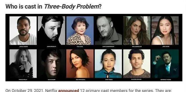 第一,Netflix(网飞)宣布了英文版《三体》剧集的首批12位演员阵容,基本都是西方人,自然这个阵容不是很受中国观众待见。