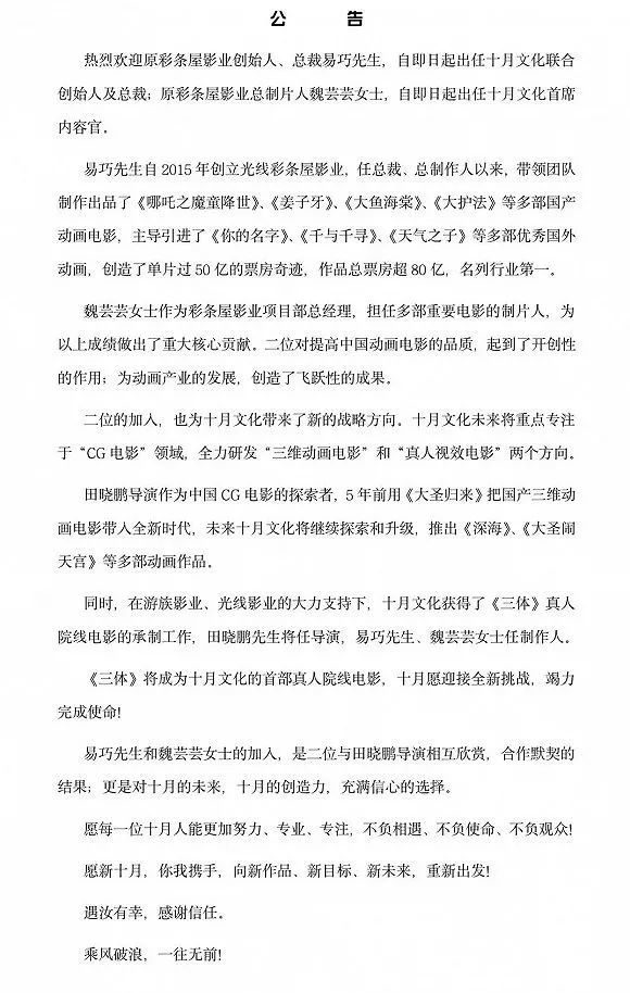 易巧是十月文化总裁,也是原光线传媒旗下彩条屋影业,2019年初,光线传媒对十月文化追加1.98亿元的投资,持股比例从20%增至28.11%。在十月文化发布的公告中提及:“在游族影业、光线影业的大力支持下,十月文化获得了《三体》真人院线电影的承制工作”。