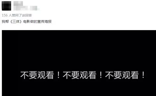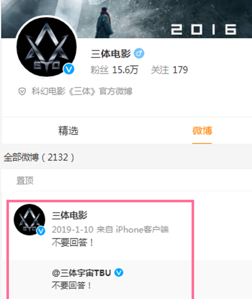 如今,电影《三体》的网络社交账号,更新的内容停止在2019年,置顶的内容是2019年1月10日转发的三体宇宙官方社交账号“三体宇宙TBU”的:不要回答。