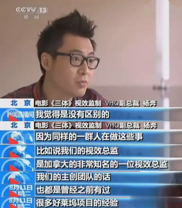 报道中称电影《三体》的特效制作的是曾经参与《阿凡达》《哈利·波特》《少年派的奇幻漂流》等影片的VHQ特效团队全权负责。