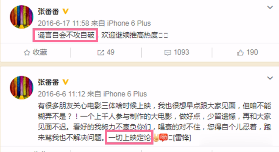 当时,导演张番番连发两条消息,称“谣言自会不攻自破”,还说“一个上千人参与制作的大电影,做好点,少留遗憾,再和大家见面不迟”。
