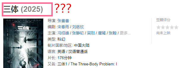 讽刺的是,2018年时,电影《三体》豆瓣主页的上映时间推迟到2019年,而如今的豆瓣主页上,电影《三体》的上映时间,不知道什么时候,已经悄悄变成了2025年。