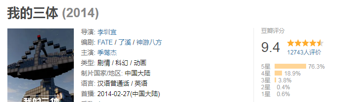2014年,粉丝自制动画番剧《我的三体》横空出世,这部改编自刘慈欣《三体》的作品,获得三体迷追捧,评分9.4。