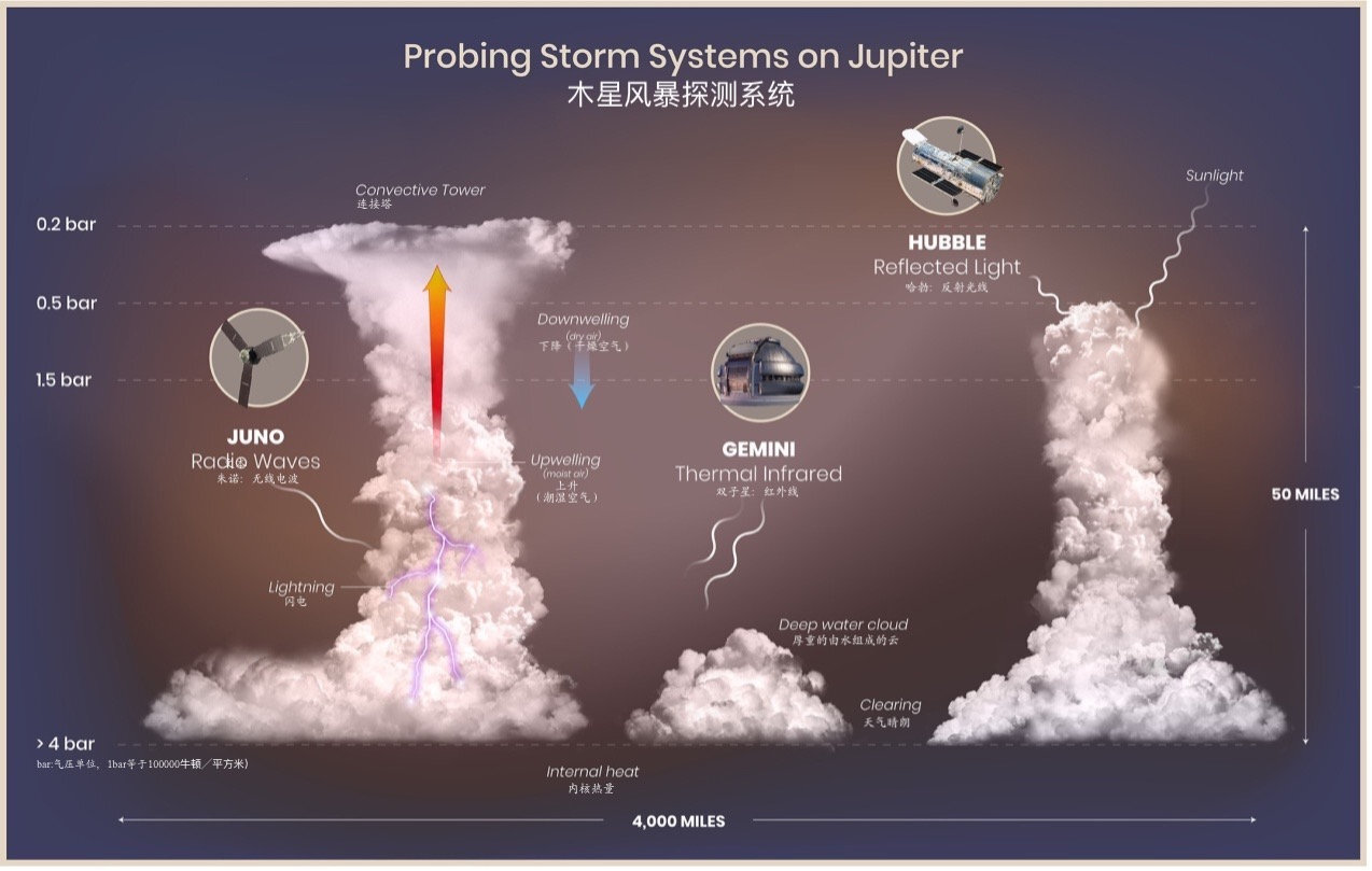 这张插图描绘了木星上风暴的形成,以及促成这些发现的设备。图像来源:NASA, ESA, M.H. Wong (加州大学伯克利分校), and A. James and M.W. Carruthers (STScI)