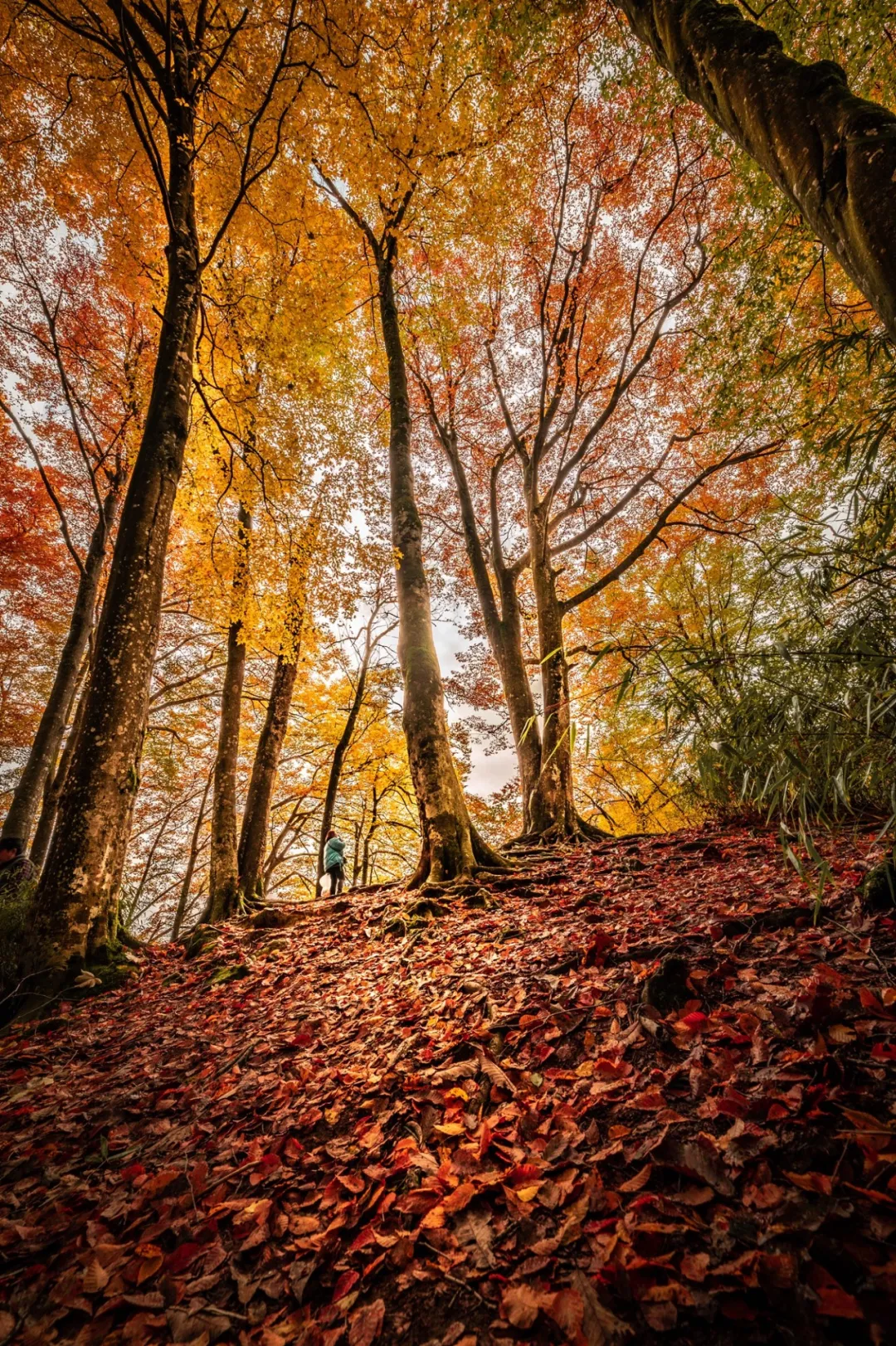 在天然画廊,一片五彩斑斓的彩林景观呈现在你的眼前,巨大的巴山水青冈树遍布整个山脊,青冈树杆有30-40米高,很多树两人才能合抱。
