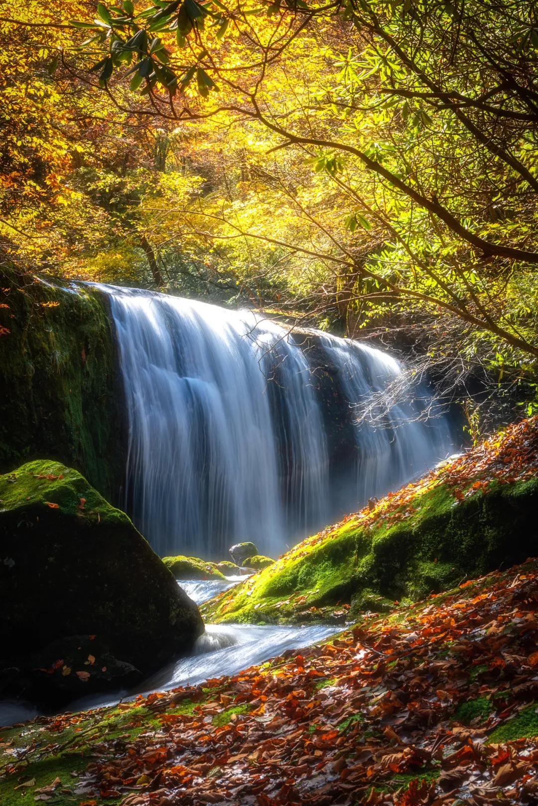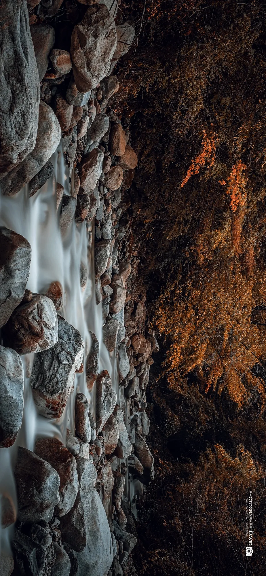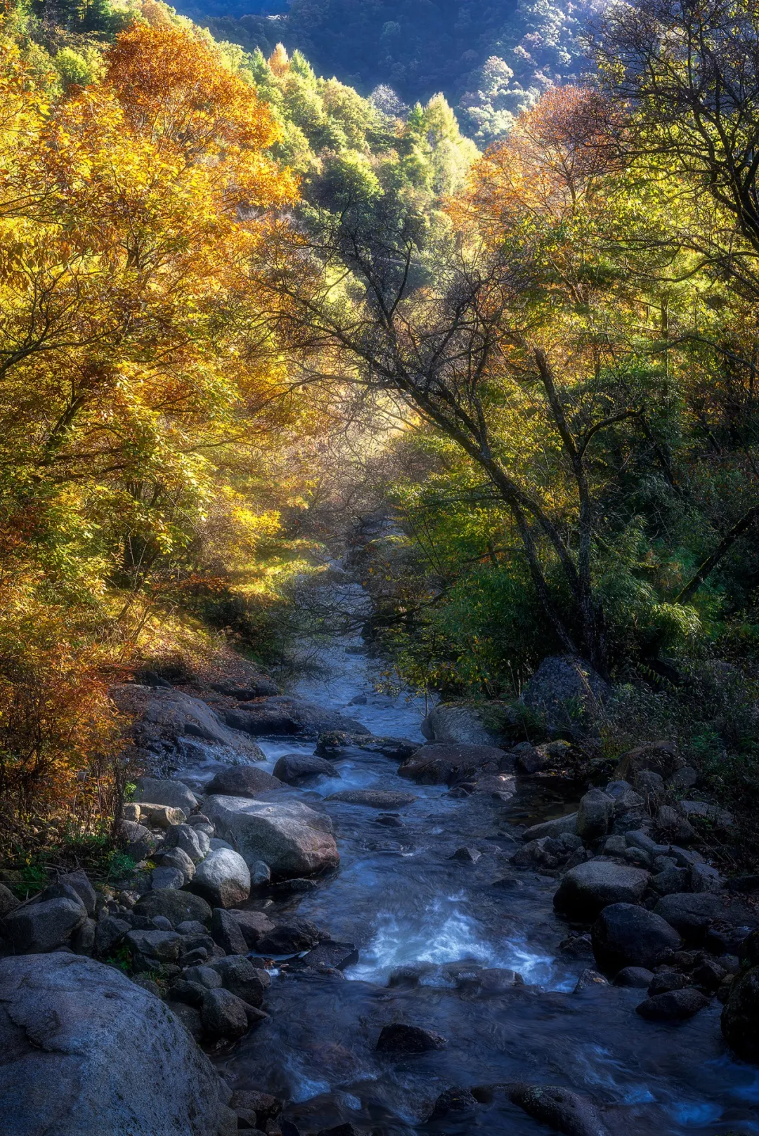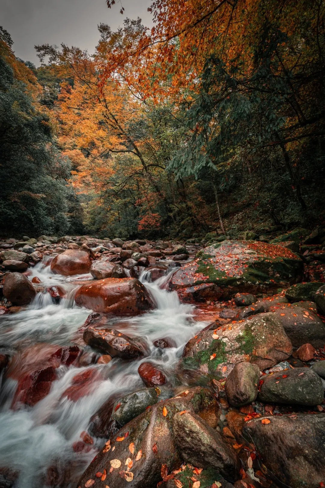 这里的水近看清澈无色,远看就有了色彩,河岸的一些地方呈淡红色,瀑布处则是白色中夹杂黄绿色,深潭处水却是深绿色。正值深秋,山上五彩斑斓,红叶与深浅不同的黄叶,种种色彩交杂在一起,构成了一幅幅纯粹绚烂的画卷。一路行来,更是让人神清气爽。