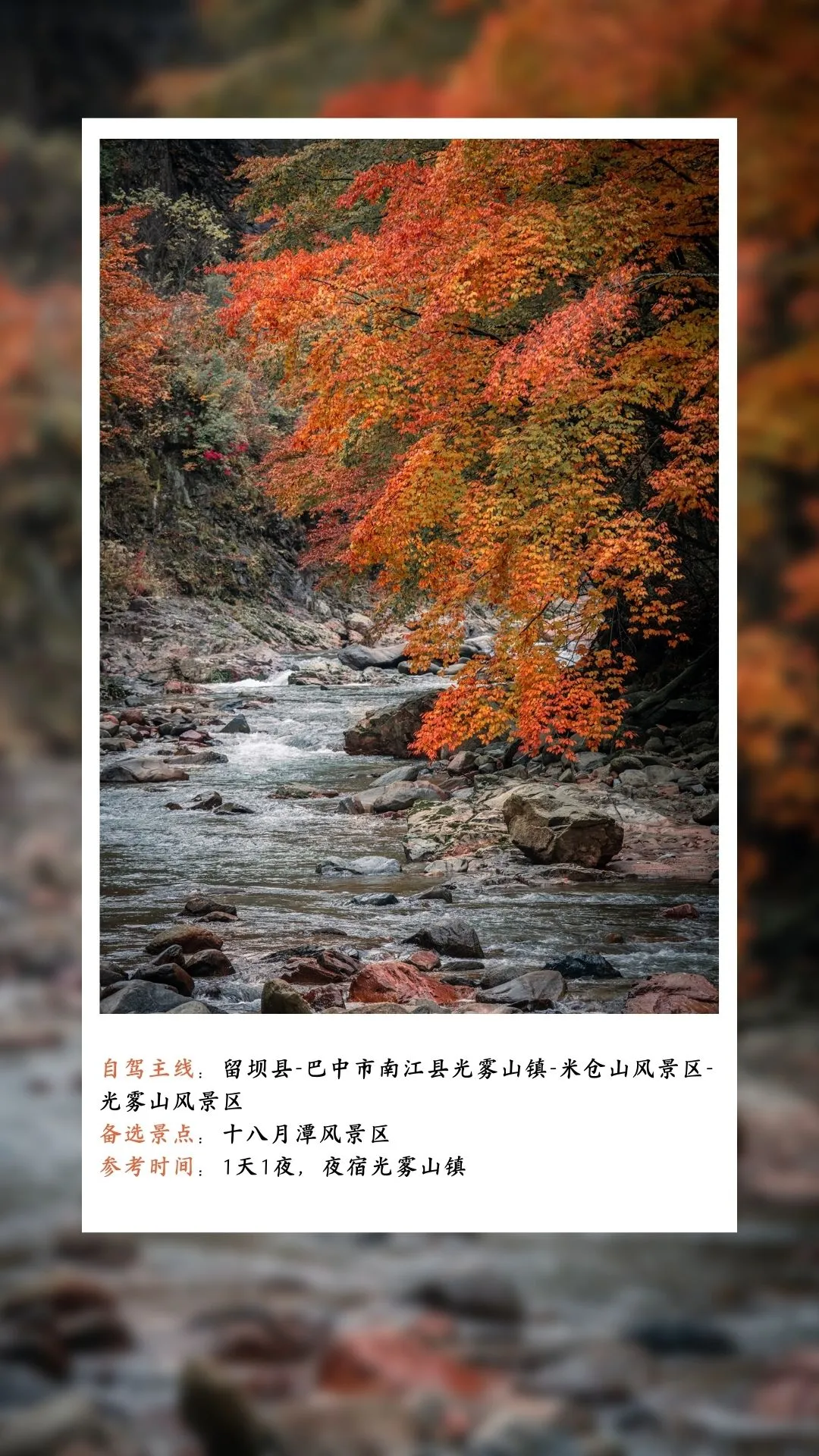 米仓山旅游景区,是四川米仓山国家森林公园所在地,以红叶观赏远近闻名,有“中国红叶之乡”美誉。秋有巴山红叶,层林尽染,有贾郭山、天然画廊、黑熊沟、香炉山、兰沟桥、牟阳故城、巴山温带珍稀植物园等精品景点。欣赏红叶主推#天然画廊、#黑熊沟、大小兰沟几个景点,最宜打卡拍照红叶美景。