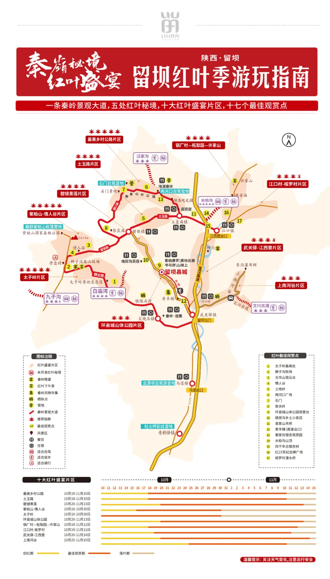 2021年留坝红叶季,以“秦岭秘境 红叶盛宴”为主题,除了适合自驾游览的秦岭最美景观大道,还有包括留坝老街、留侯古镇、红叶秘境等等适合漫步或徒步的景点。