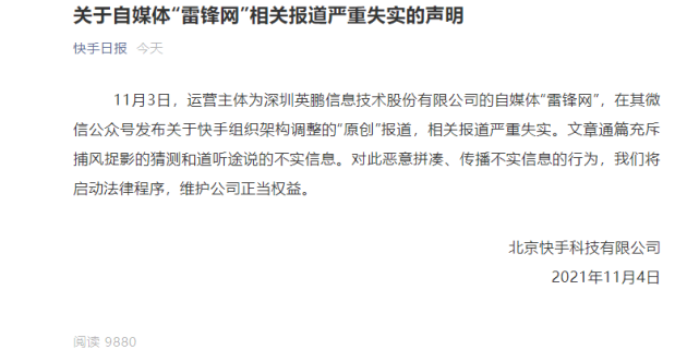 对于该报道,11月4日,快手日报发布声明称,11月3日,运营主体为深圳英鹏信息技术股份有限公司的自媒体“雷锋网”,在其微信公众号发布关于快手组织架构调整的“原创”报道,相关报道严重失实。文章通篇充斥捕风捉影的猜测和道听途说的不实信息。对此恶意拼凑、传播不实信息的行为,公司将启动法律程序,维护公司正当权益。