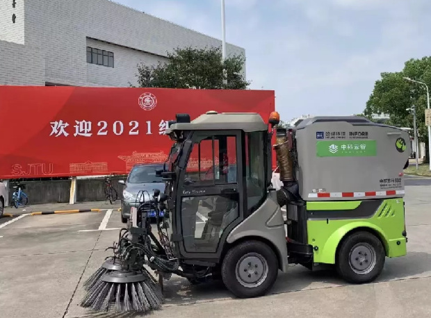 沪上的秋风唤醒了绚烂多彩的校园,灰绿相间的盈峰环境5G无人驾驶新能源环卫车穿行于上海交通大学的美丽校园,所到之处,落叶、纸屑等垃圾纷纷一扫而净,引来了莘莘学子的驻足观看,甚至有不少同学上前交流产品的5G无人环卫作业技术。上海交通大学创建于1896年,原名南洋公学,现已发展成为一所世界“双一流”建设A类高校、国际知名大学。在这所秋意浓浓、充满活力的美丽校园里,这款科技感十足的“智慧环卫精灵”穿梭其中,俨然成为了一道靓丽生动的新风景。