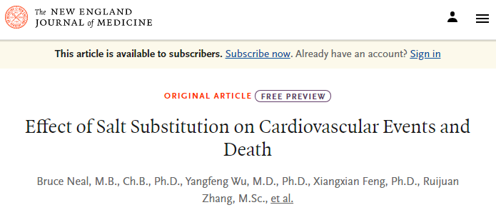 [1]Neal B,Wu Y,et al.Effect of Salt Substitution on Cardiovascular Events and Death[J].NEJM.2021.