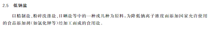 在《食品安全国家标准食盐》(GB2721-2015)中,低钠盐被定义为:以精制盐、粉碎洗涤盐、日晒盐等中的一种或几种为原料,为降低钠离子浓度而添加国家允许使用的食品添加剂(如氯化钾等)经加工而成的食用盐。