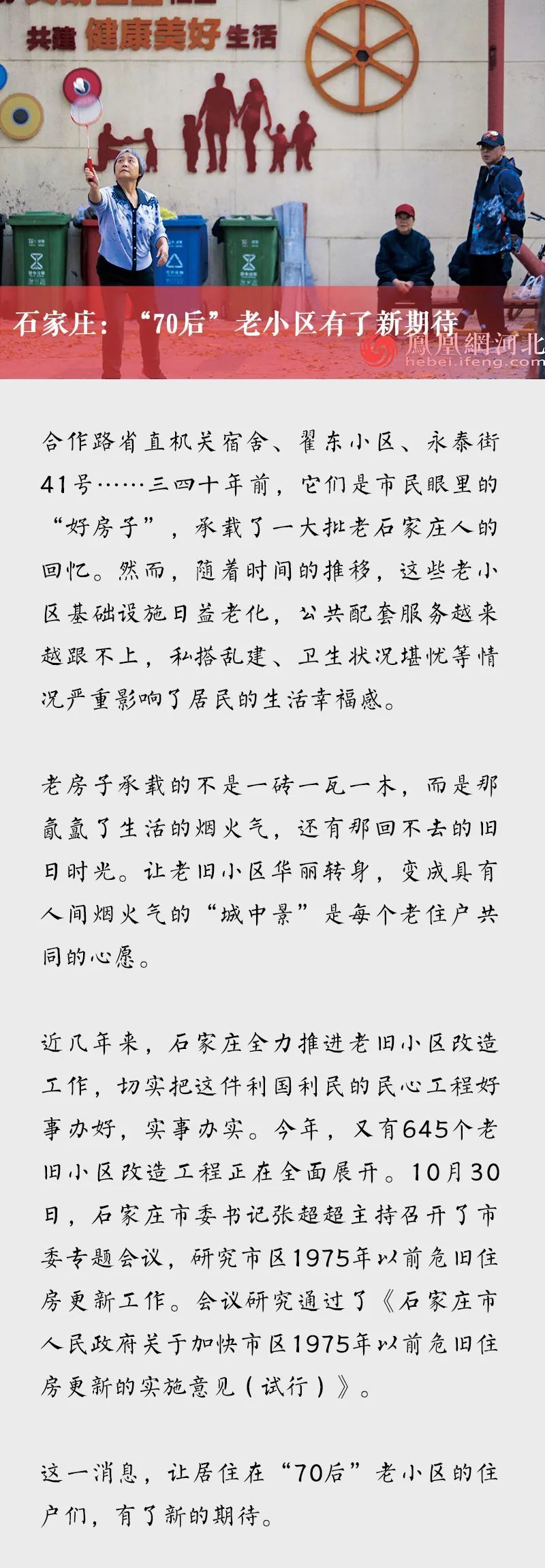 推进危旧住房更新,石家庄已在行动。10月30日,石家庄市委书记张超超主持召开了市委专题会议,研究市区1975年以前危旧住房更新工作。张超超指出,推进危旧住房更新是一项重大的民生工程,是认真贯彻以人民为中心发展思想的实践检验,是贯彻落实省委、省政府支持意见的具体行动,是改善城市面貌、提高群众生活质量的迫切需要,是在二环内做“减法”、二环外做“乘法”,深入实施拥河发展战略、拉开城市发展框架的应有之义,对于建设现代化、国际化美丽省会城市具有重要意义。