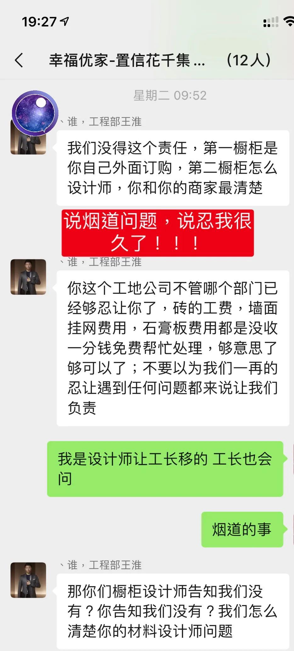 烟道,因为烟道太靠门口,做橱柜深度做不了那么长,做那么长就会很丑,从进场到下橱柜的单,没有任何人告知我改烟道的事,我在幸福优家的装修群里问他们怎么可以这么不负责,但凡负责任那么一点点我也不至于贴完橱柜的墙砖,又要砸了重来,他们部门工程部的自称总监王淮、经理熊强开始怼我,说忍让我很久了够意思了,烟道不该他们负责,他们也没有义务和责任提醒我,我找做橱柜的,做橱柜的说我们只做橱柜设计,烟道移动不移动那是装修公司设计师该想到的,我就问问大众朋友,这是谁的责任,装修公司有没有义务提醒?