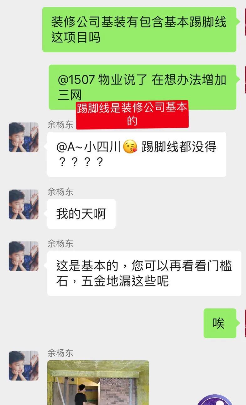 踢脚线的问题,装修公司给我说踢脚线他们不负责安装,那么问题来了?踢脚线是不是基装部分,有过找装修公司半包经验的人都知道踢脚线装修公司是不是该管?后来我写了新闻曝光你们,再后来我去幸福优家找了你们设计总监,你们设计总监给我承诺踢脚线你们会安排工人安装的,为了弥补到时候踢脚线算你们的,我也就没有追究了。