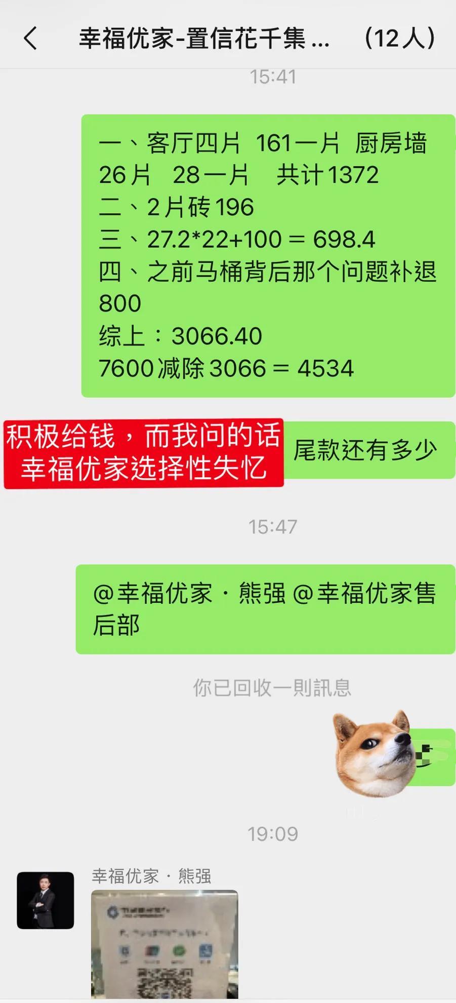 关于验收,一开始签约合同时候说的好,每一个工程进度都会安排监工,群里每天都会汇报工作,结果呢?装修群除了你们工程部总监怼人和经理骂人以外,还有什么用?从进场到贴完砖哪一项找过我签字确认?没有,这就是你们岚庭幸福优家不负责、虚伪狰狞的真实面目。
