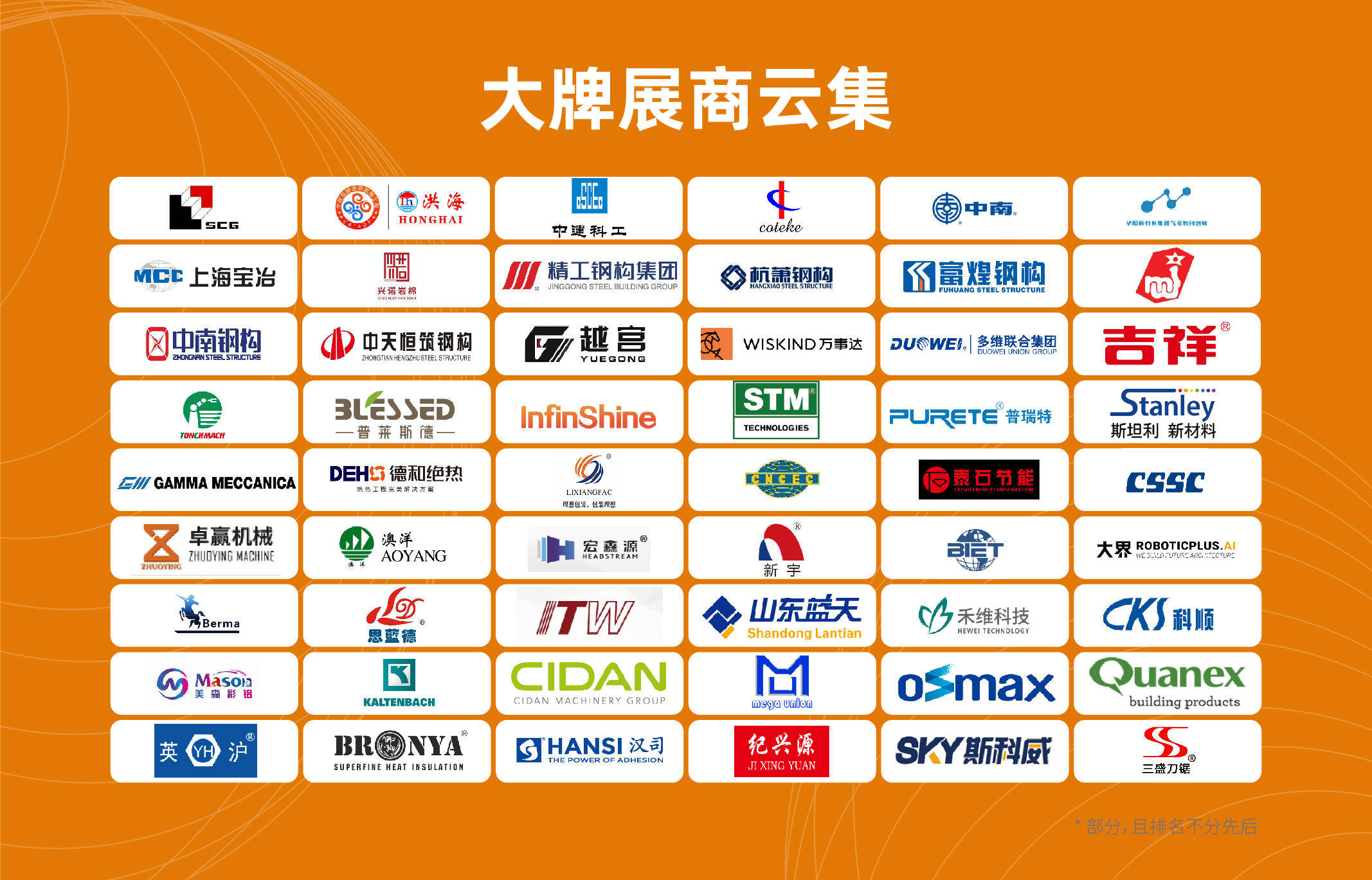 辽宁洪海、天津中辰、阳煤集团、上海中南、澳洋保温、斯帝姆、华陆、上海炀和、杭萧钢构、山东万事达、山东宏鑫源、多维联合、宝都国际、蓝天板业、钢之杰、天津新宇、美国ITW-依工建筑、常州卓赢、邯郸兴诺、泉州东辰、安徽纪兴源、普莱斯德、上海吉祥、邯郸理想、盖马美凯尼卡、中船重工第七〇二所、斯科威、徐州和成、常州英来、杭州业伊、天意机械、中天海诺、常州金源、浙江久石、山东玉辉、江苏泽建、山东俏工匠、中原思蓝德高科、美国Quanex(柯耐士)、上海迈联、重庆禾维、世锐建筑、翔盛紧固件、卡巴赫机械、锐泰建筑、澳泰防水、龙禹船舶、中建科工、中南建设集团、精工钢构、上海宝冶等业内知名企业将各自携旗下产品和设备参加。各家展商依托此次展会行业平台,向广大经销代理商、建筑工程公司、建筑设计院、建筑研究院所、房地产开发商、电力及石化工程公司、政府机构和行业组织等领域的行业用户进行展示推广。