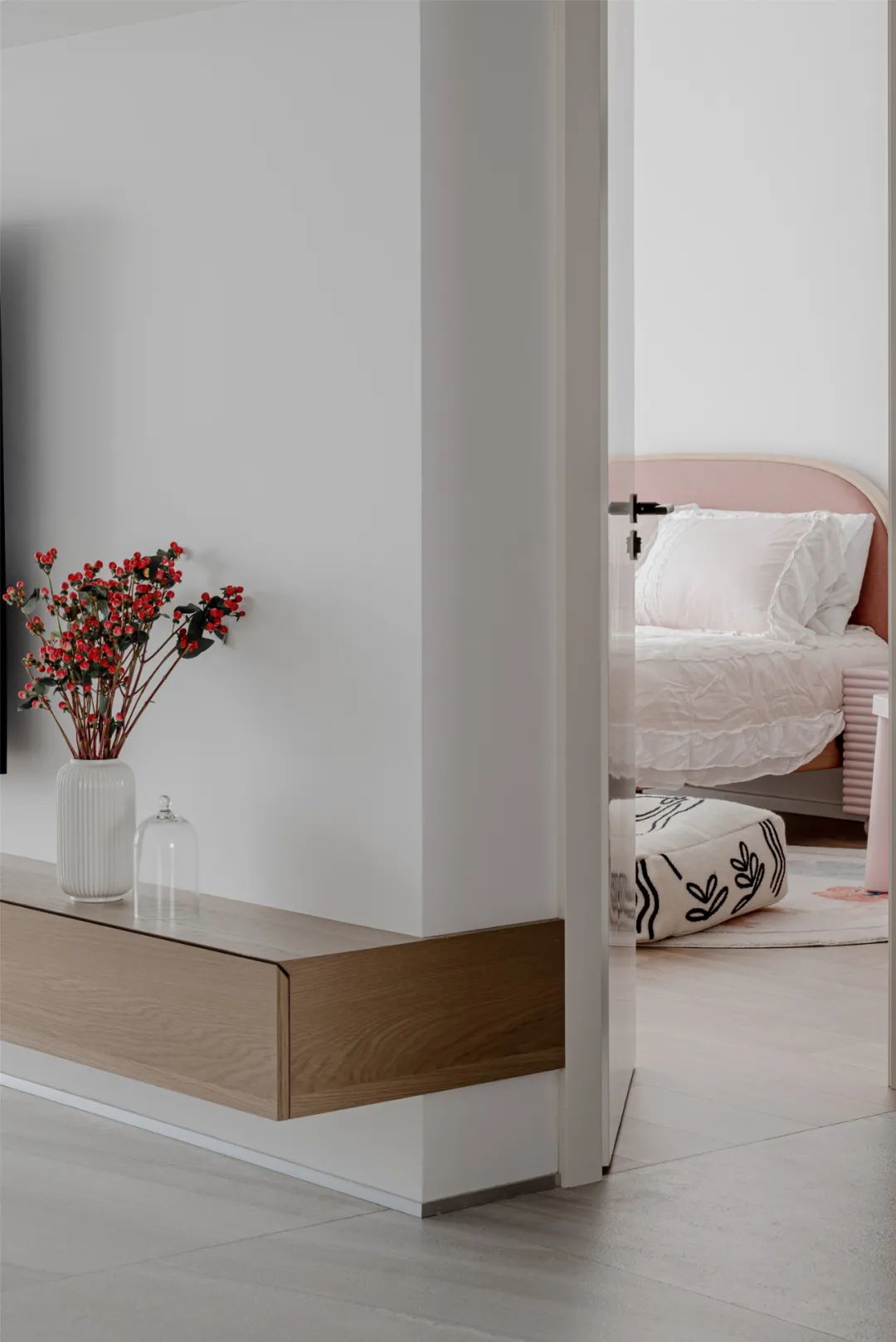 ▲儿童房门外的悬空木质电视柜,摆上鲜花与简洁的花瓶,与儿童房的淡雅空间保持一致的朴素与舒适气息。