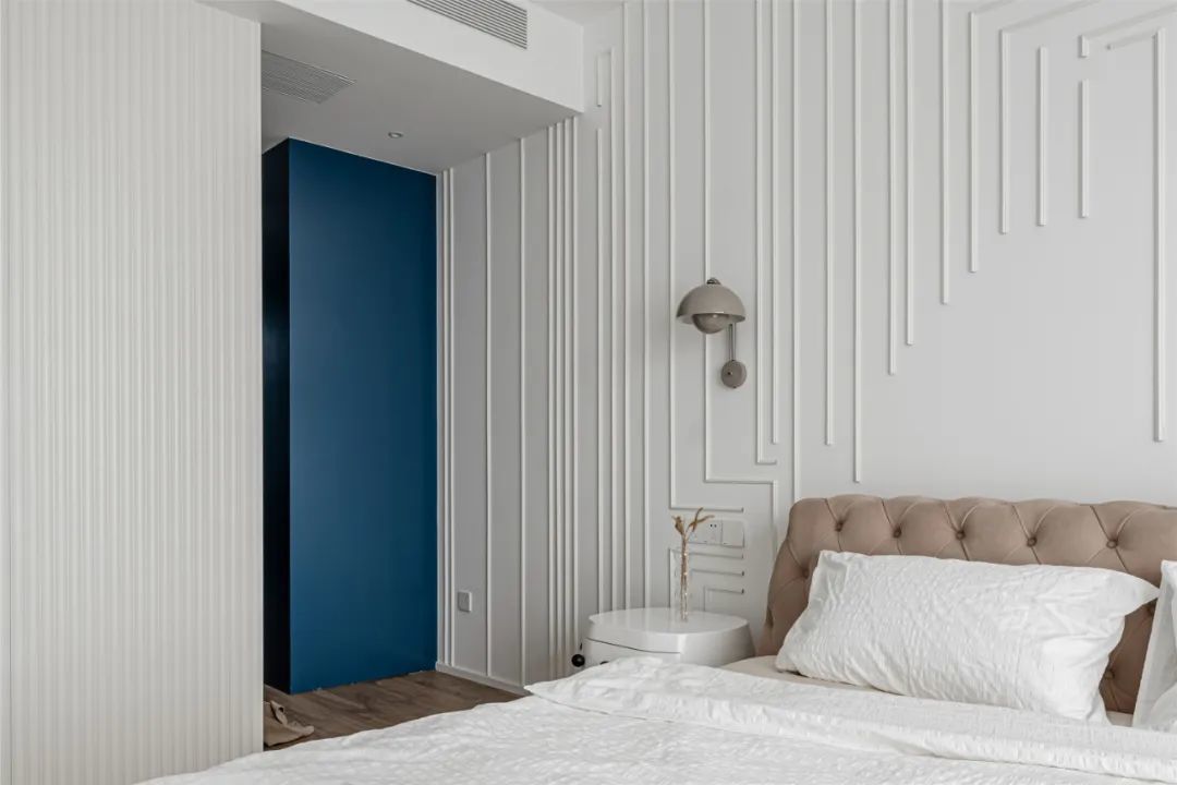 ▲卧室床头墙装上独特的条纹装饰,并在两侧加入灰色的壁灯,布置灰咖色的布艺床,侧边过道还加入了安静的蓝色元素,让空间显得干净优雅而舒适。