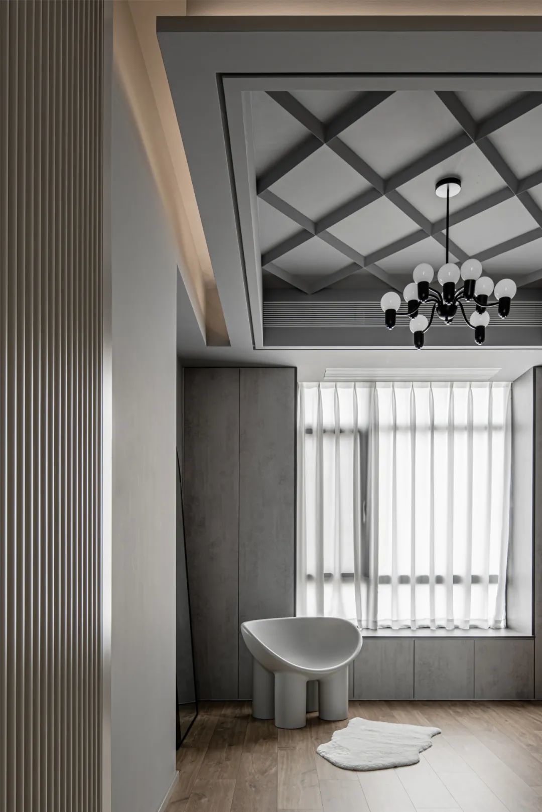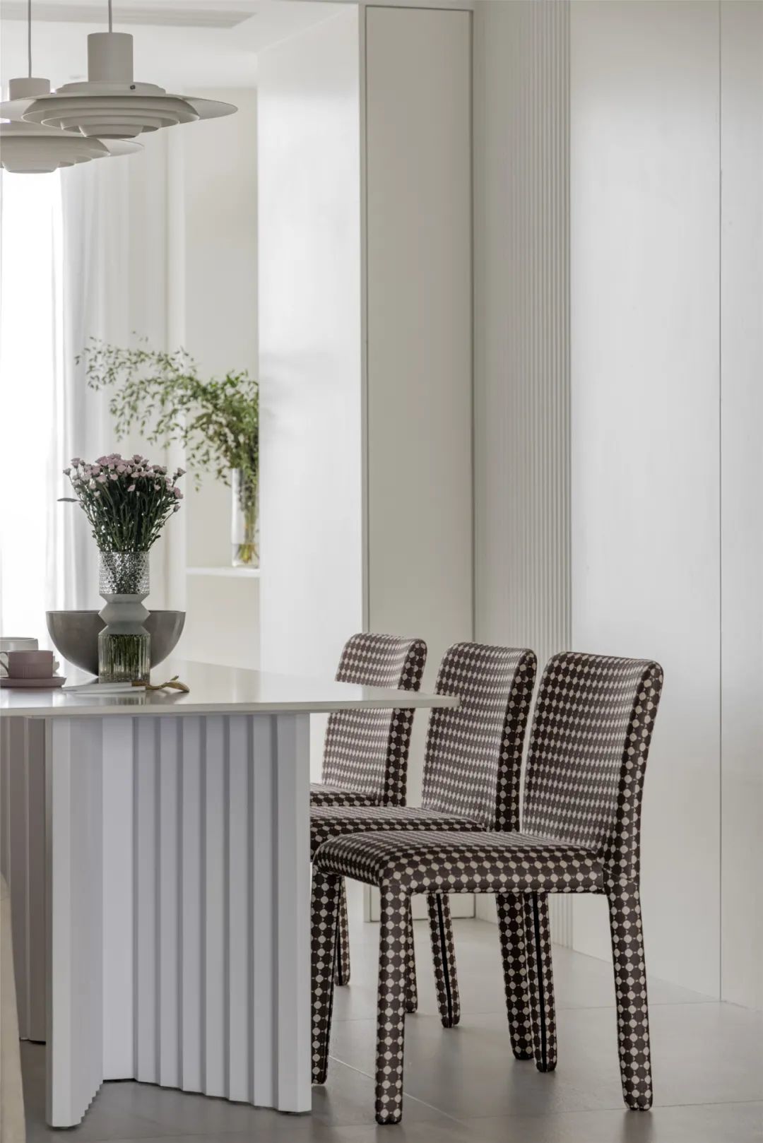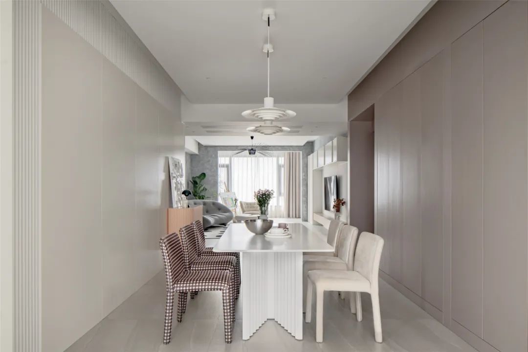 ▲餐厅墙面一侧是乳白色护墙板、一侧是木饰面,中间吊顶在两端预留灯槽,中间装一盏造型独特的吊灯,布置上现代优雅的餐桌,还有格纹餐椅与米白色餐椅组合,也让用餐空间显得更加现代舒适而情趣。