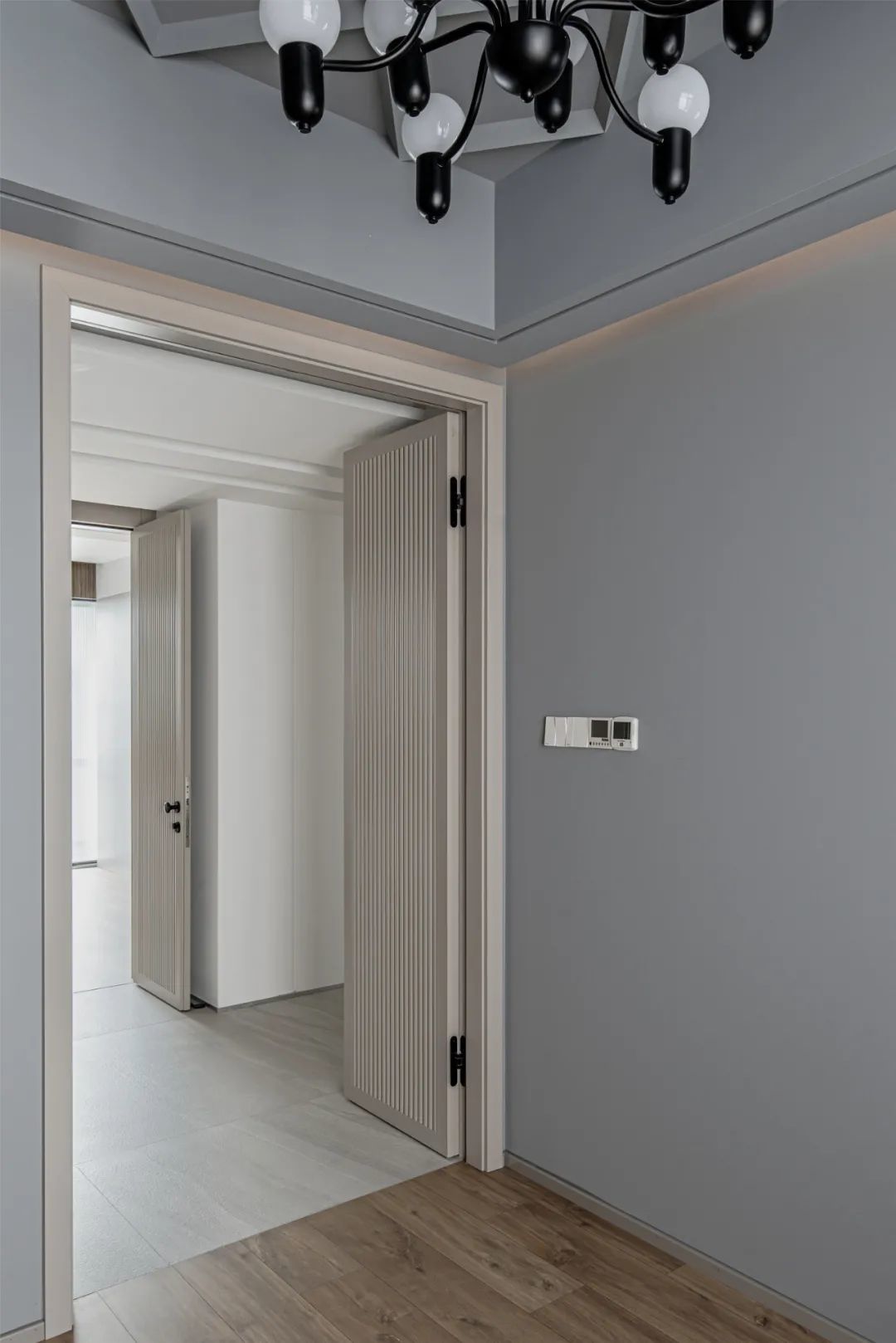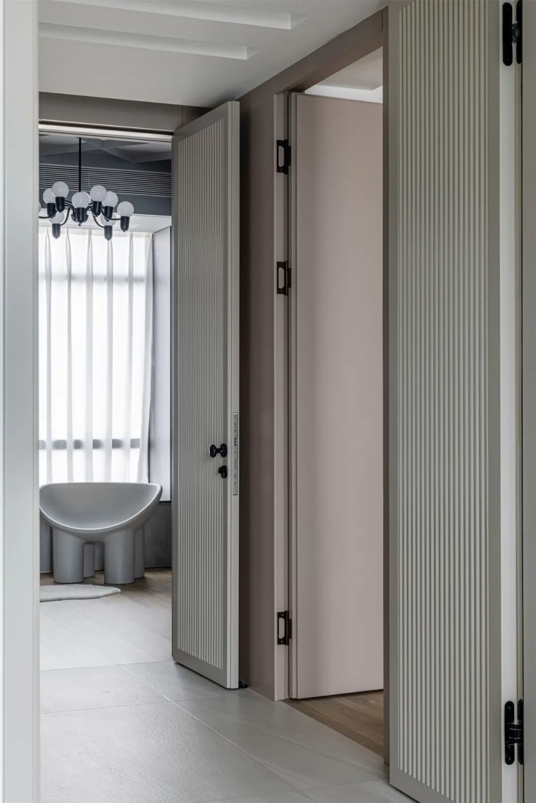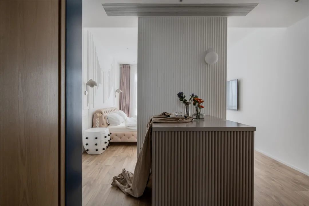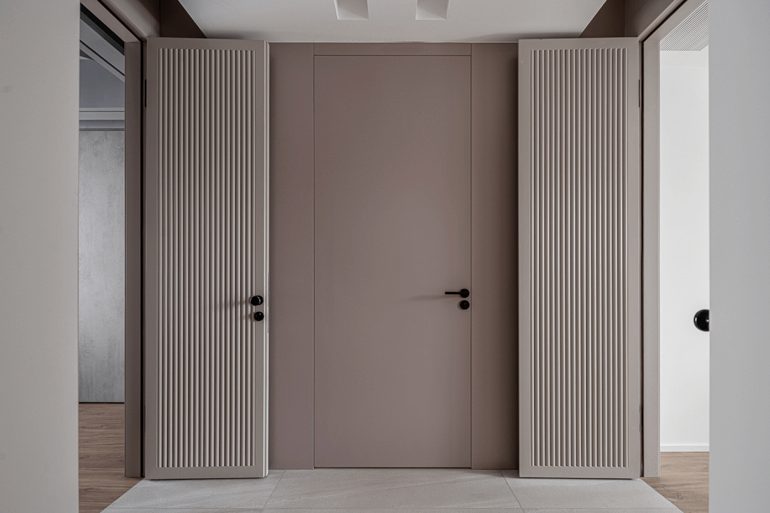 ▲过道以独特的对称造型与隐形门设计,两侧的门开过来与中间咖色隐形门相呼应,形成了一个和谐统一的设计效果,在素雅的空间基调下,也带来了一个轻松优雅的端庄与舒适感。