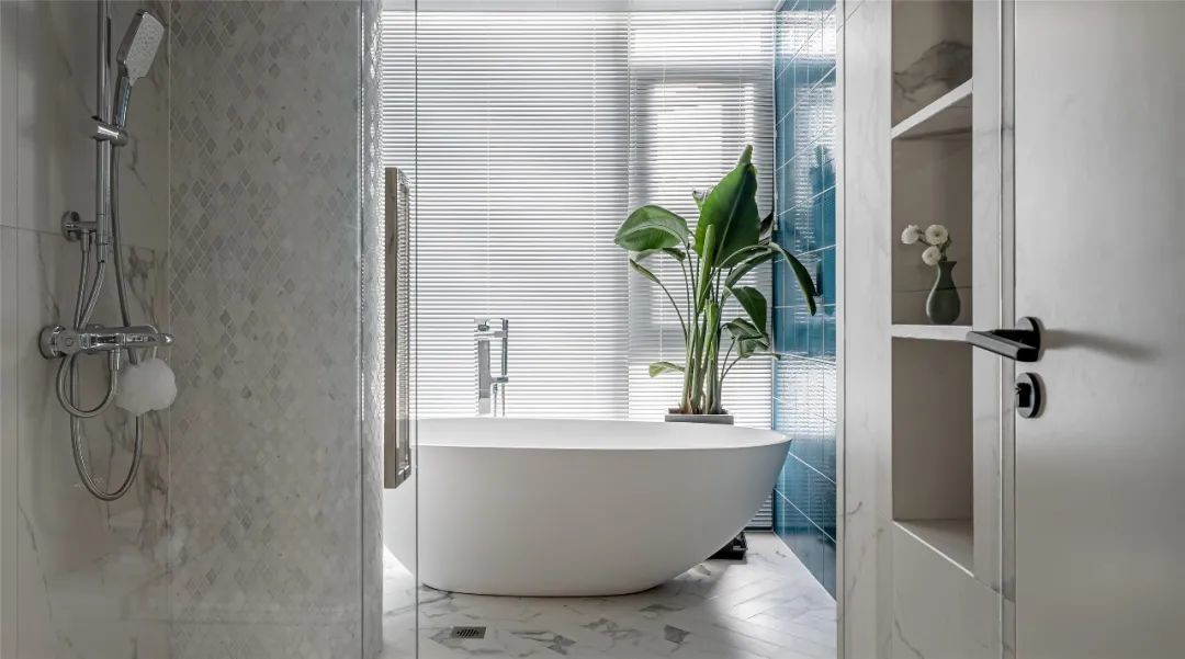 ▲在卫生间的格局上,从外往里分别是洗手盆、马桶、淋浴房与浴缸区,淋浴房设置壁龛收纳,让卫浴用品有更实用的放置位置,最里侧的窗户以百叶帘的设计,布置浴缸与大盆绿植,也让空间显得更加文艺精致。