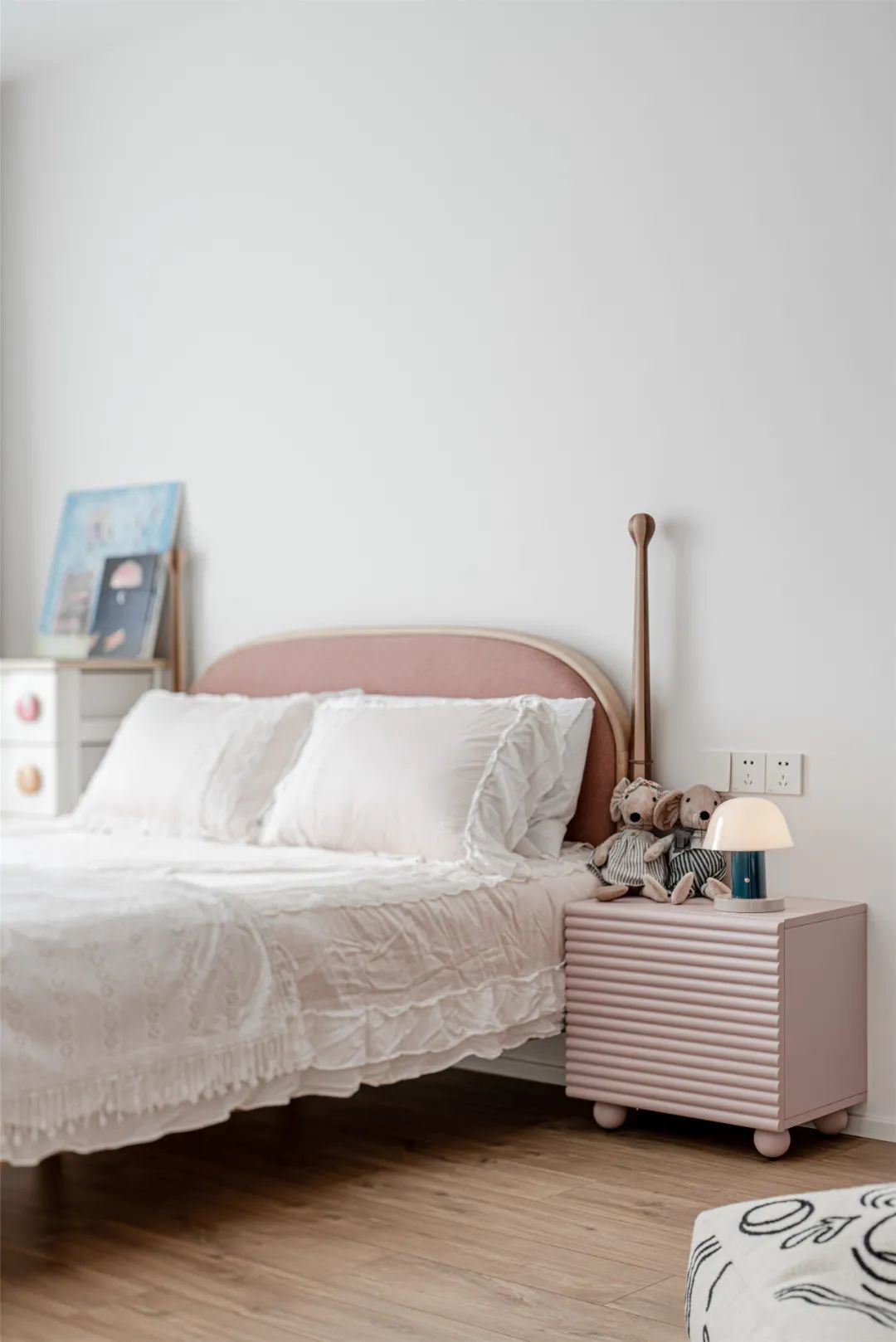 ▲儿童房以简洁的墙面空间基础,布置上一张粉色布艺靠背床铺,还有粉色的床头柜,摆上可爱的公仔与台灯,也让整个儿童房显得更加童趣活泼而可爱。