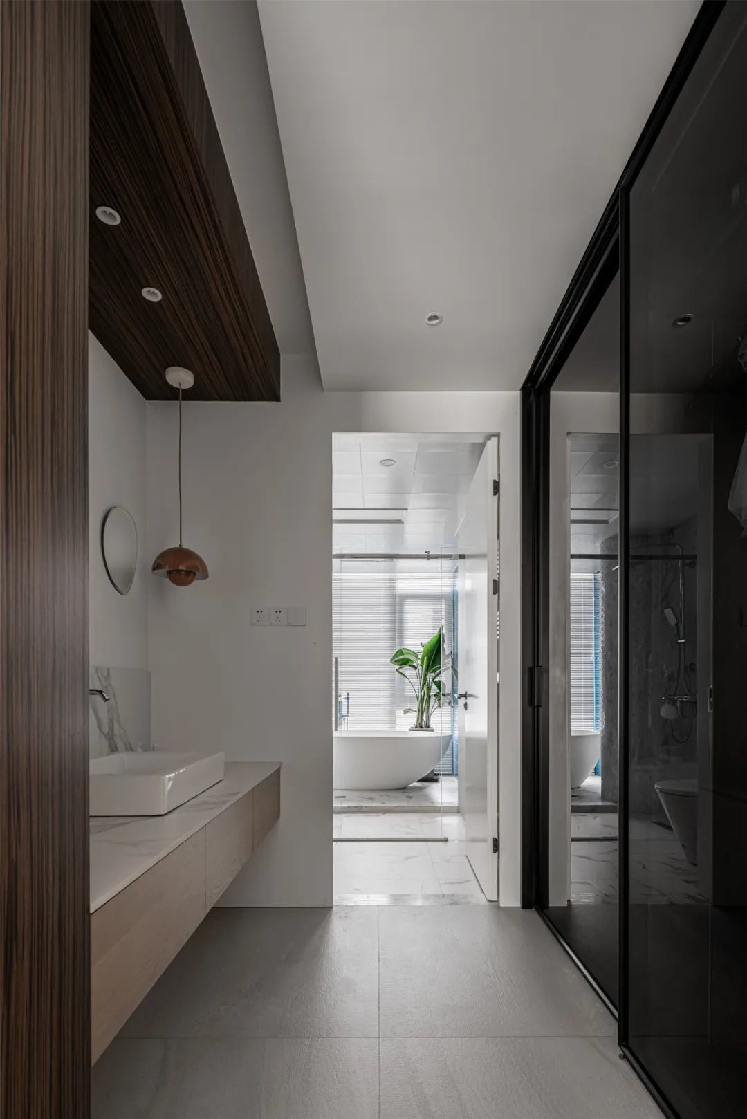 ▲卫生间洗手盆外置过道区域,台面岩板基础加入台上盆的设计,装上木色浴室收纳柜,在左侧与顶上的木饰面材质装饰,也增加了空间的设计高级感,后方是一个玻璃柜门的柜子设计,带来一种实用端庄的体验。