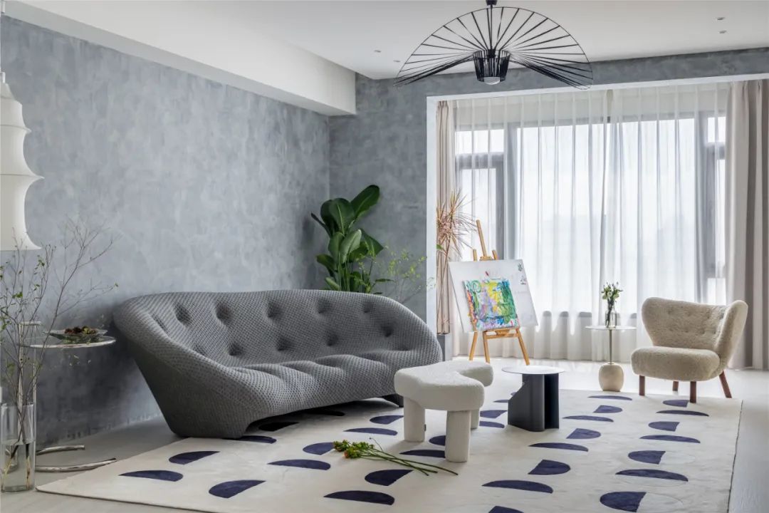 ▲现代舒适的客厅,在墙面加入灰色墙布,布置一张简雅造型的灰色布艺沙发,角落布置一盆芭蕉绿植,显得清新文雅而舒适;地上铺上黑白配的地毯,还有创意造型的小茶几与休闲椅,靠窗布置千年木与画架,整个空间都充满简约自在的舒适感。