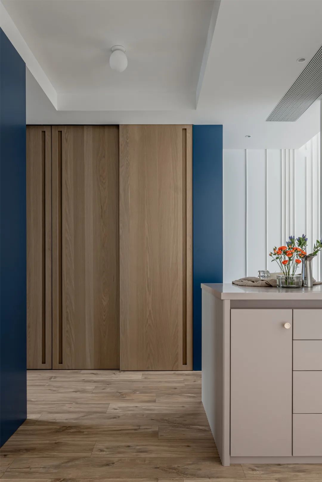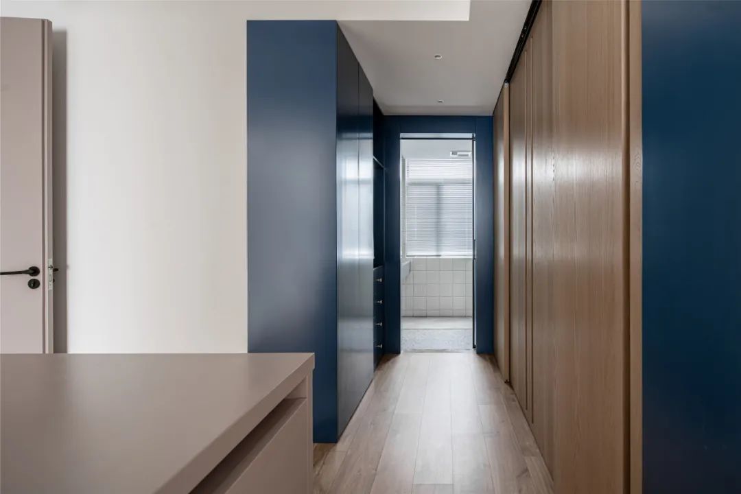 ▲过道式的收纳柜布局成衣帽间式的格局,为主人提供了一个方便灵活的收纳体验;在蓝色与木色的空间下,整个衣帽间都呈现出一种简约舒适的安静与惬意感。