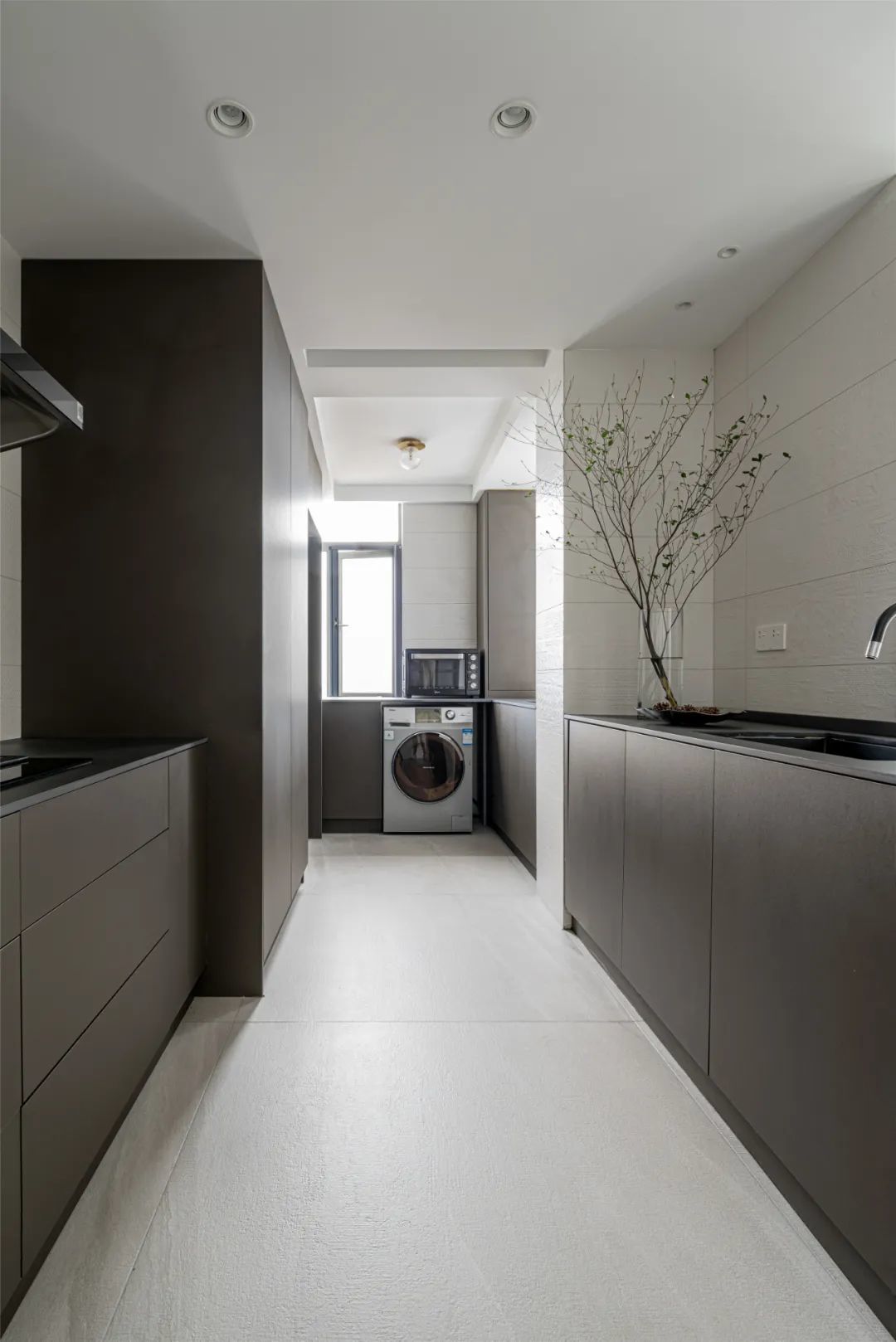 ▲厨房最里侧的生活阳台与厨房打通,布置嵌入台下的洗衣机,上方也加入嵌入式的电器,让空间利用更加到位。