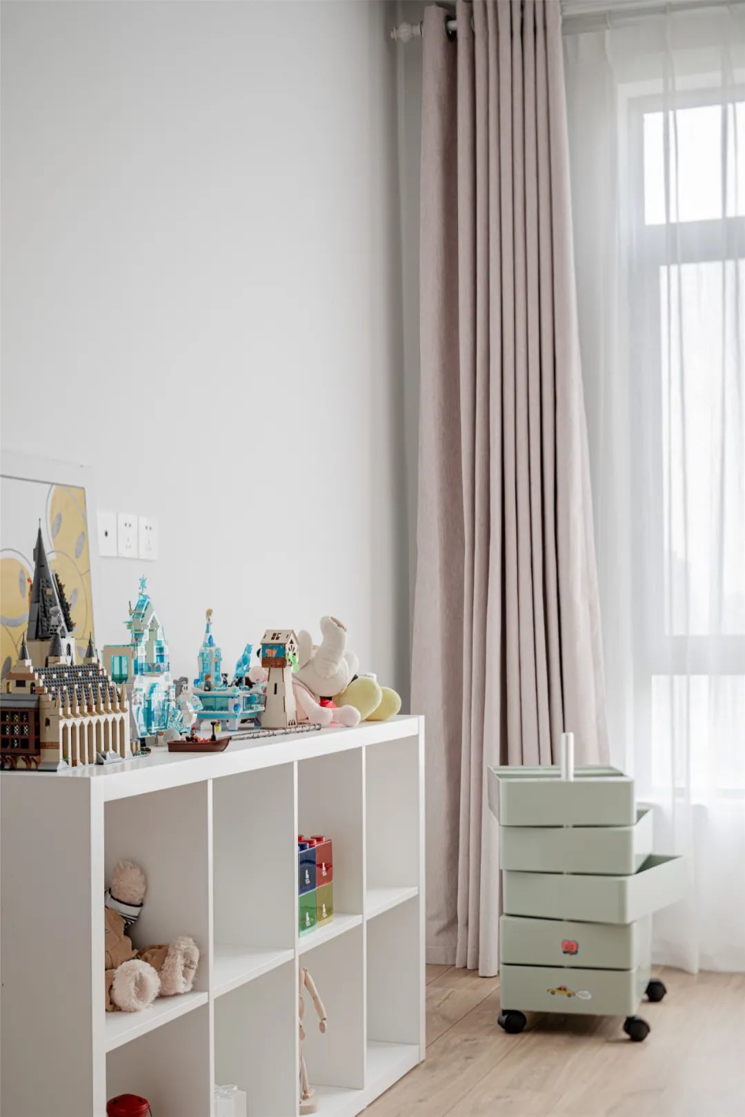 ▲床尾摆一个小矮柜,开放柜格里摆上玩具与公仔,为孩子提供了一个收纳玩具的好地方,可以从小就培养孩子的整理习惯,淡粉色的窗帘,窗边还有一个淡绿色移动收纳架,在实用童趣的基础,营造出一个浪漫可爱的空间。