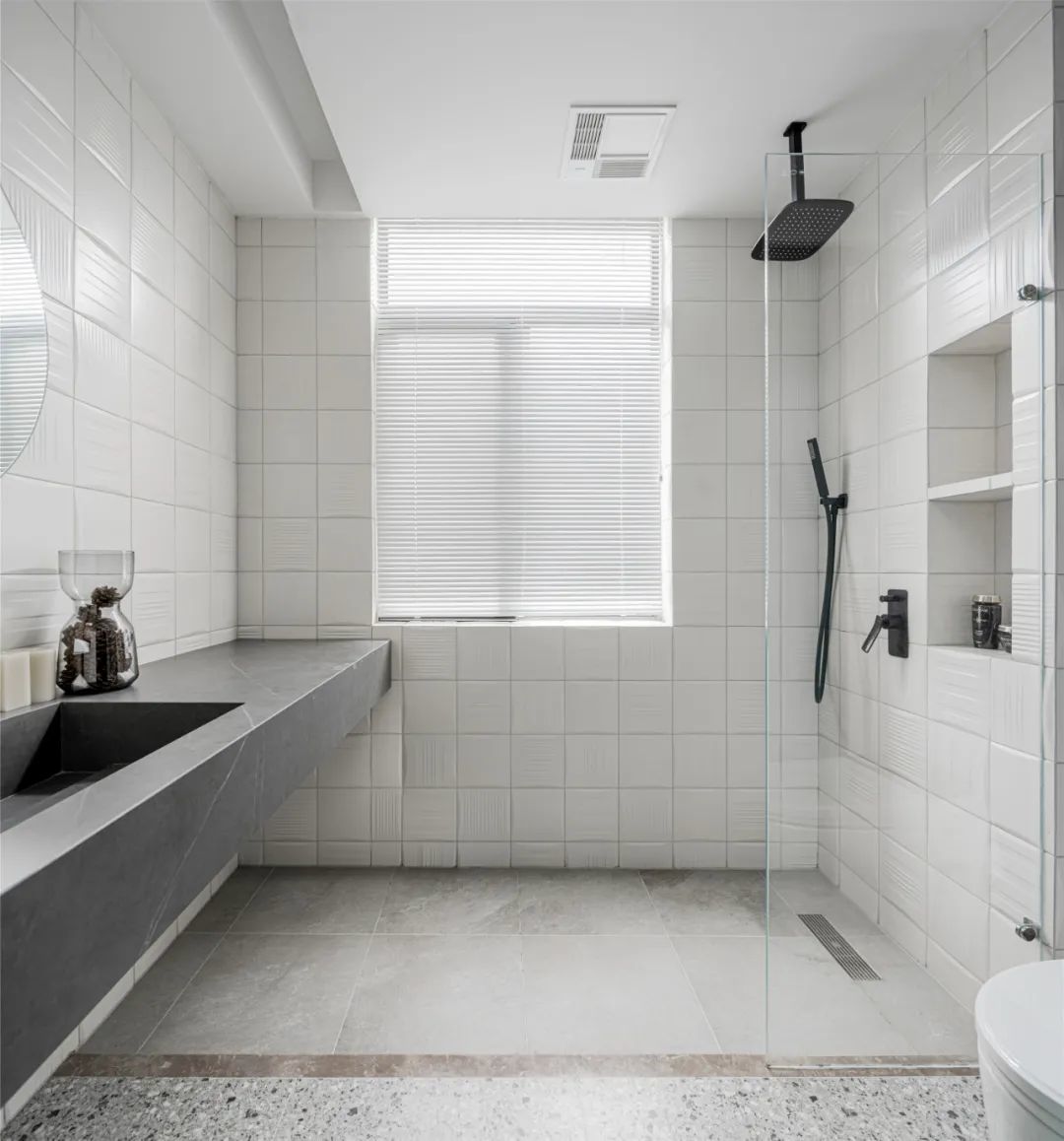 ▲主人房里的卫生间,整体墙面以白色小格砖的空间,定制岩板洗手台延伸到窗户的墙上,装上白色百叶帘,在淋浴房里面也是加入了壁龛的设计,营造出一种文艺端庄的卫浴氛围。
