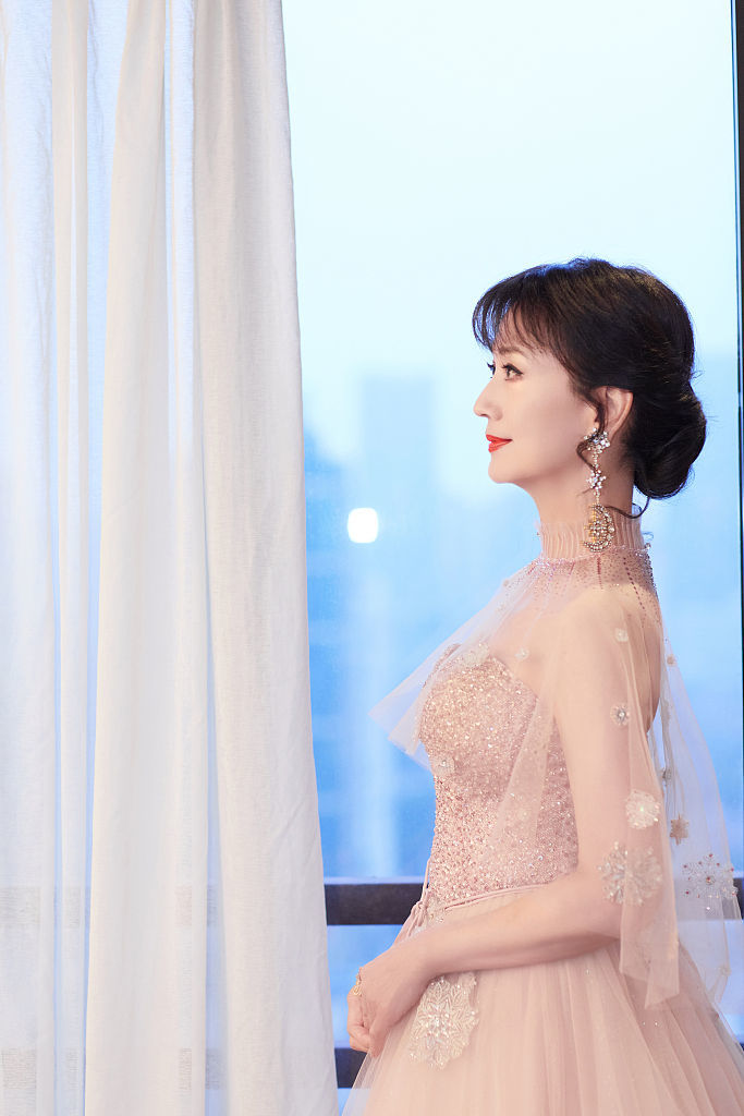 赵雅芝着粉色星光长裙 临窗而立精致优雅“侧颜杀”
