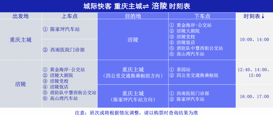重庆主城至涪陵方向在陈家坪汽车站和西南医院门诊部可乘车,而从涪陵至重庆主城方向有2个行驶路线,一个是开往陈家坪汽车站,一个是开往四公里交通换乘枢纽,在茶园地铁站可下车。城际快客“重庆主城—涪陵”线路详细的乘车点及班次如下: