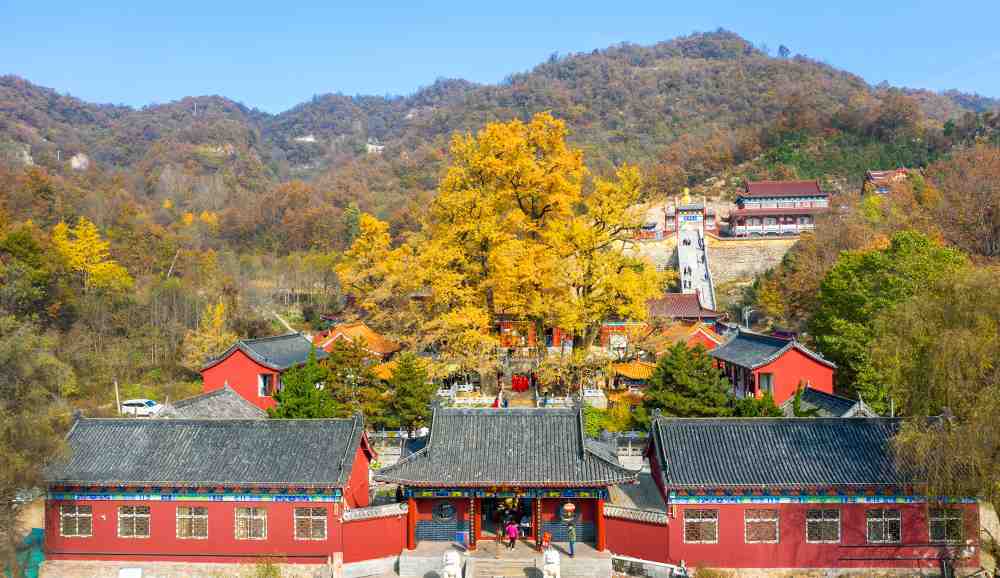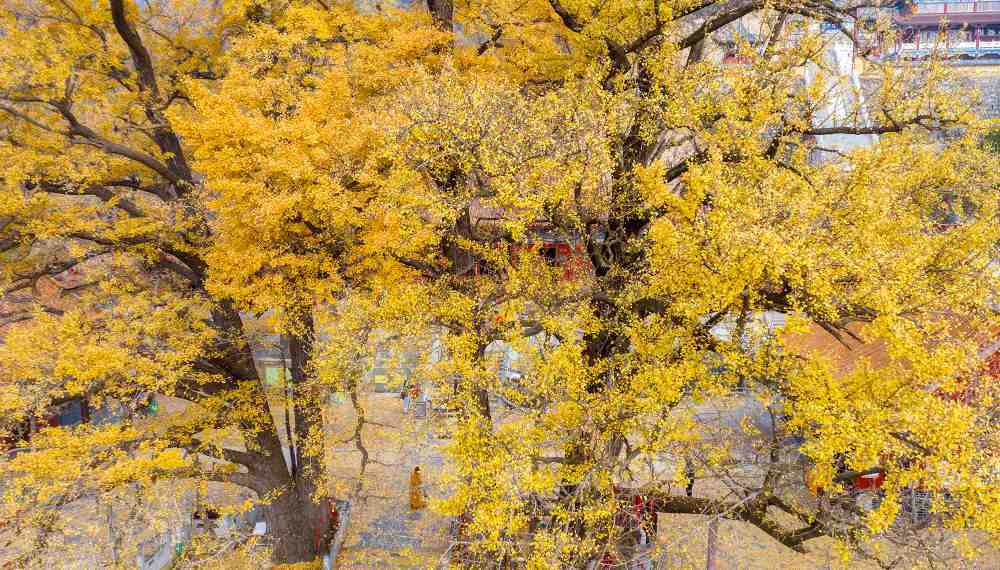 但真正使文殊寺闻名遐迩的,却是寺内的5棵参天古银杏。文殊寺中的至宝是五株老银杏树,号称世界树王。五棵2800岁的古银杏树,前三后二,三雌二雄,缀连成片,成为文殊寺一道特别的风景。